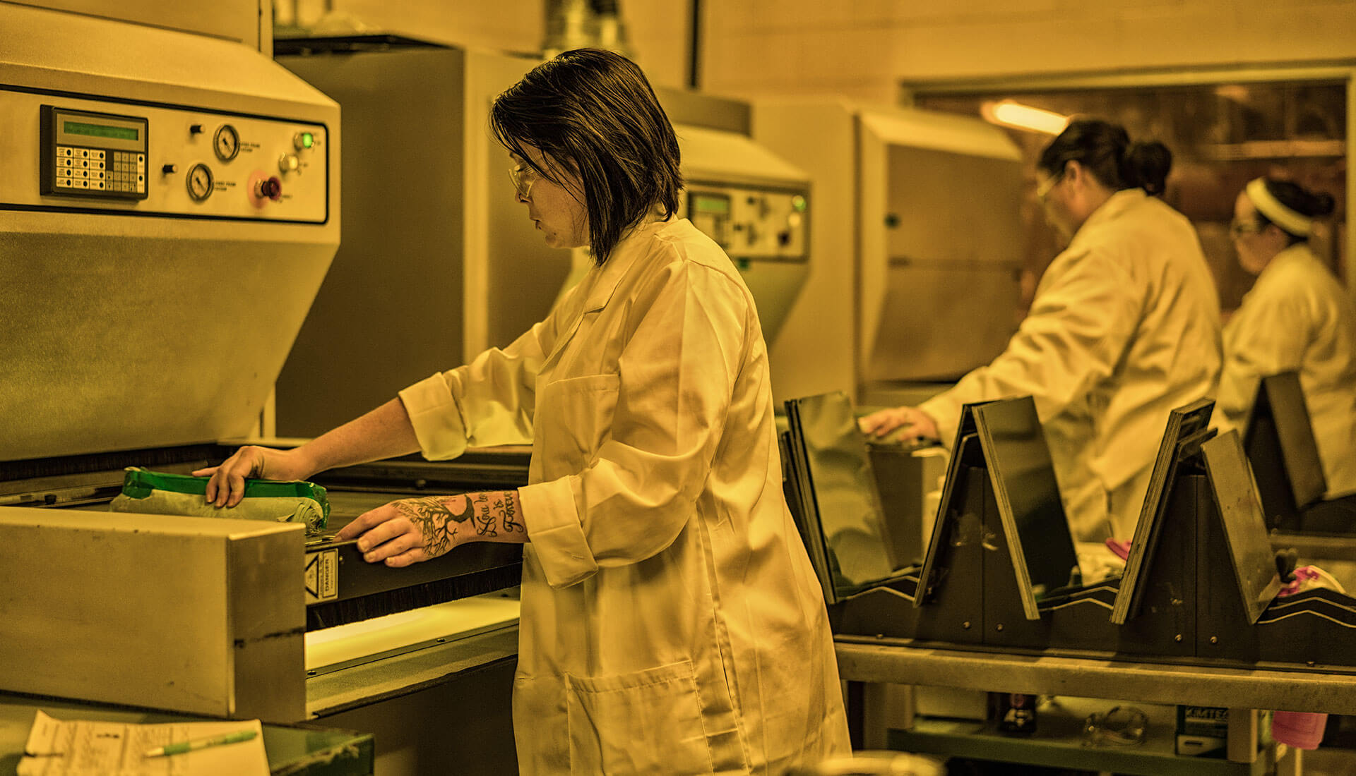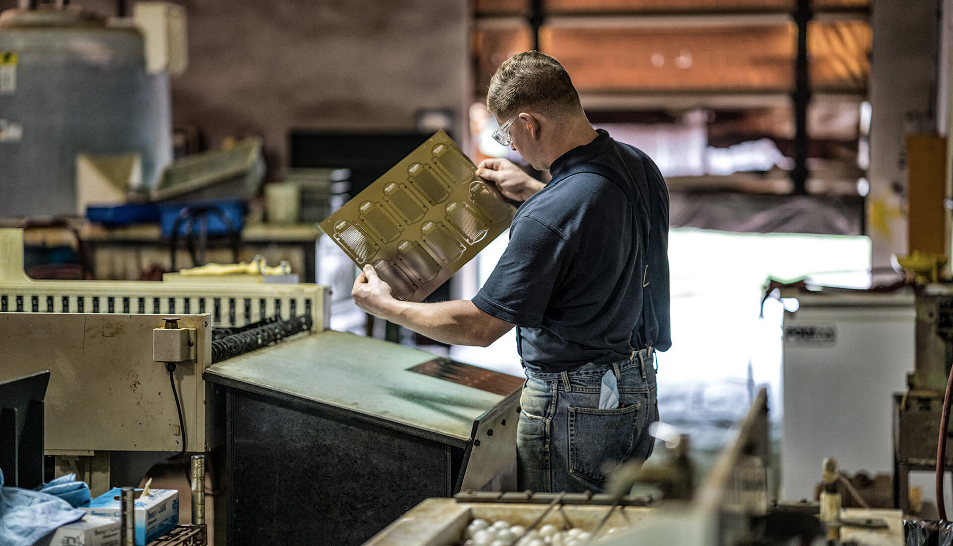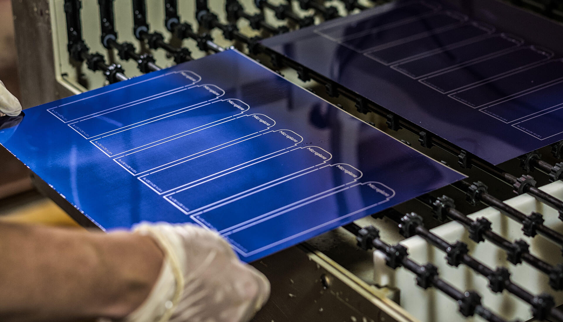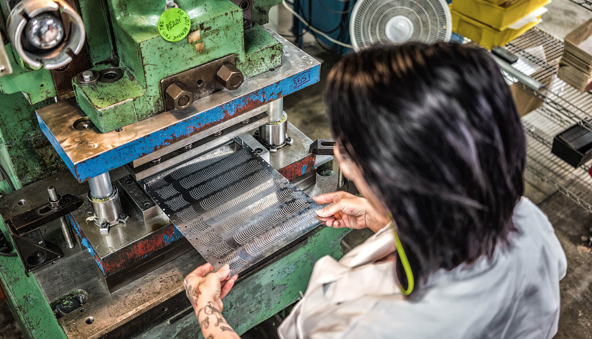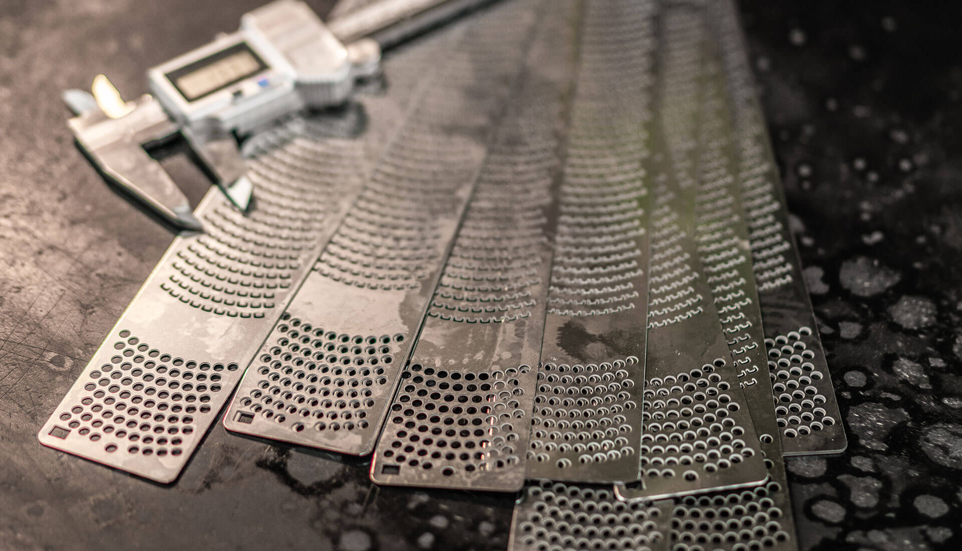 Microplane puts a photosensitive resist film onto first-rate stainless steel sheets to mask and protect certain areas. Then, a photographic image of the blade is exposed on the film that shows the exact shape and size of the teeth. A special Ferric Chloride solution is sprayed on the sheets and dissolves the exposed parts that were left unprotected by the resist to form Microplane’s perfectly shaped and ultra-sharp cutting edges.